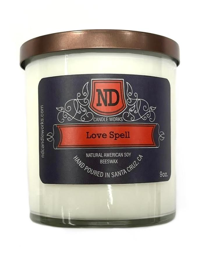 "Love Spell" candle by ND Candle Works, natural American Soy Beeswax candle in glass with lid, 9 oz.